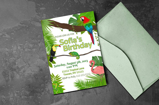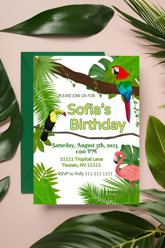 Tropical Bird Invitation | Jungle | Luau | Digital Party Invite |Toucan | Birthday| Shower| Parrot| Flamingo Party| Rainforest Birds| Leaves