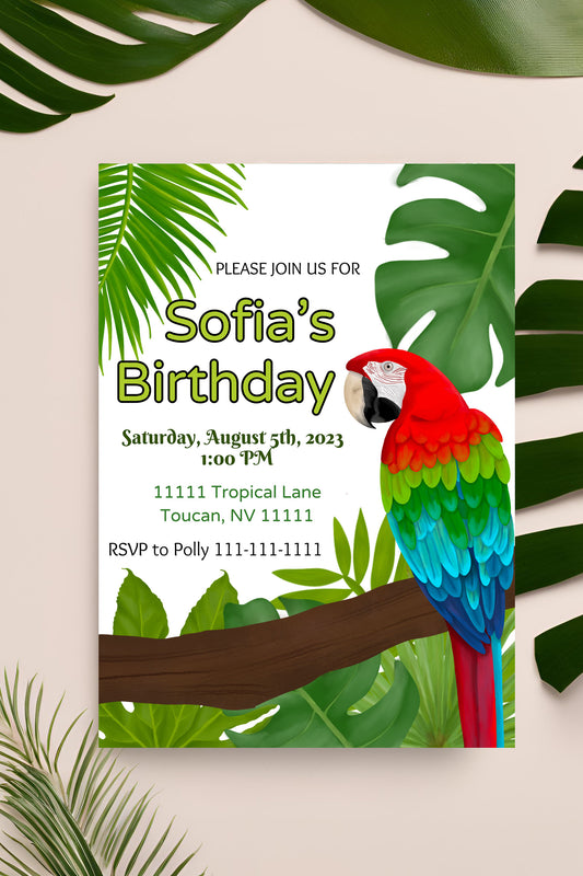 Parrot Party Invitation | Rainforest | Digital Party Invite | Birthday| Shower| Tropical Birds | Parrot Birthday| Luau | Jungle | Leaves